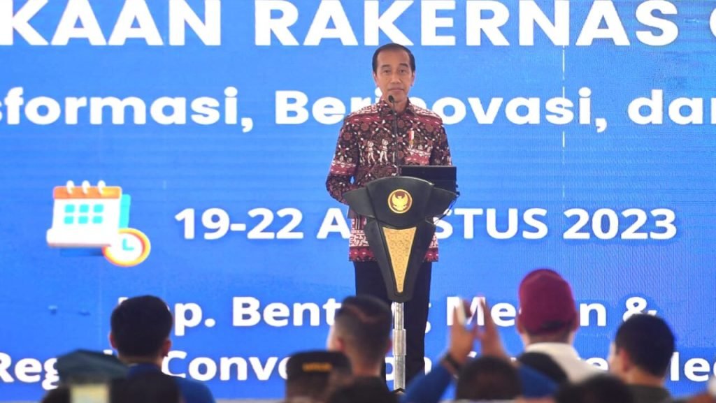 Presiden Joko Widodo menghadiri pengukuhan kepengurusan dewan pimpinan pusat (DPP) dan peresmian pembukaan rapat kerja nasional (rakernas) Gerakan Angkatan Muda Kristen Indonesia (GAMKI) Tahun 2023 di Lapangan Banteng, Kota Medan, Provinsi Sumatra Utara, pada Sabtu, 19 Agustus 2023. Dalam sambutannya, Presiden menekankan pentingnya menjaga persatuan dan kekompakan di tahun politik yang mulai menghangat.