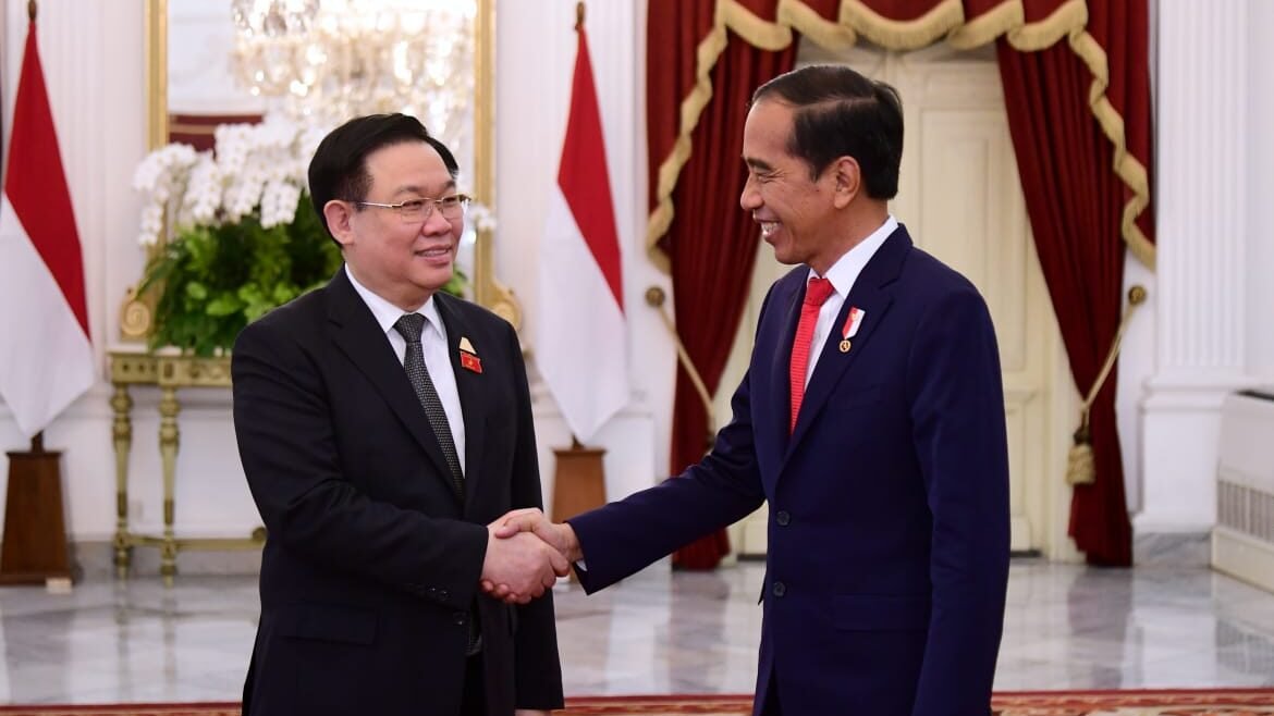 Presiden Joko Widodo menerima kunjungan kehormatan Ketua Parlemen Vietnam, Vuong Dinh Hue, beserta delegasi di Istana Merdeka, Jakarta, pada Senin, 7 Agustus 2023. Dalam pembukanya, Presiden Jokowi kembali menekankan peran penting parlemen sebagai cerminan keterwakilan rakyat.