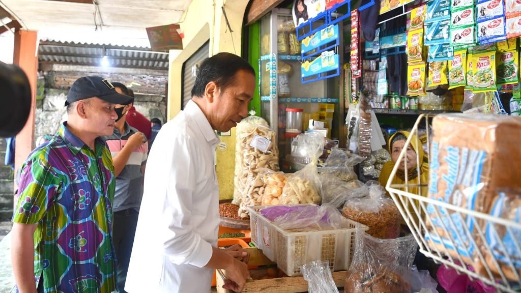 Presiden Joko Widodo meninjau aktivitas perdagangan dan mengecek harga komoditas di Pasar Sentul, Kota Yogyakarta, Provinsi Daerah Istimewa Yogyakarta (DIY), pada Minggu pagi, 8 Januari 2023. Dalam keterangannya usai peninjauan, Presiden menyebut bahwa harga kebutuhan pokok di Pasar Sentul masih cenderung stabil.