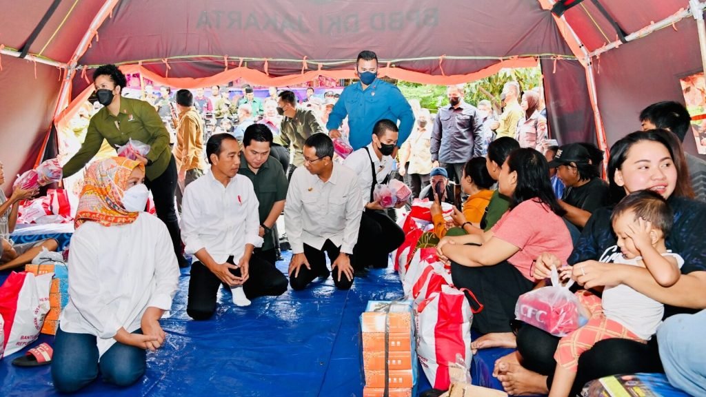 Presiden Joko Widodo didampingi Ibu Iriana Joko Widodo meninjau langsung posko pengungsian korban kebakaran Terminal Bahan Bakar Minyak (TBBM) Pertamina Plumpang yang ada di Ruang Publik Terpadu Ramah Anak (RPTRA) Rasela, Rawa Badak Selatan, Jakarta, pada Minggu, 5 Maret 2023.