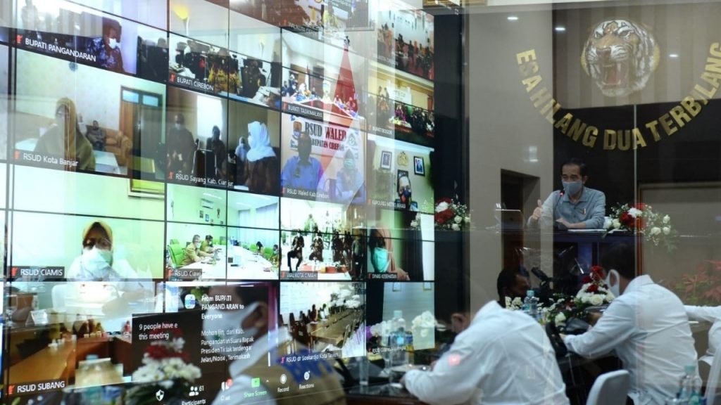 Presiden Jokowi memberikan pengarahan melalui konferensi video untuk penanganan Covid-19 terintegrasi Provinsi Jawa Barat di Posko Penanganan dan Penanggulangan Covid-19, Markas Kodam III/Siliwangi, Kota Bandung, Provinsi Jawa Barat, Selasa, 11 Agustus 2020.