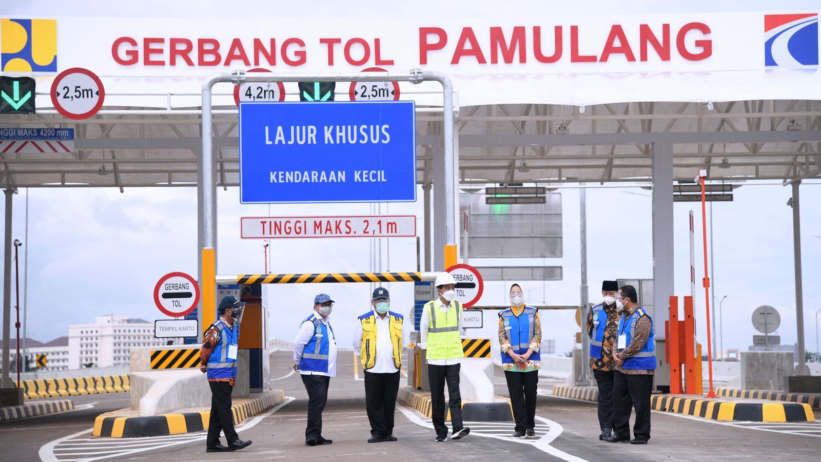 Presiden Republik Indonesia, Joko Widodo meresmikan Jalan Tol Serpong-Cinere ruas Serpong-Pamulang dan Jalan Tol Cengkareng-Batu Ceper-Kunciran di Gerbang Tol Pamulang, Kota Tangerang Selatan, Provinsi Banten pada Kamis, 1 April 2021.