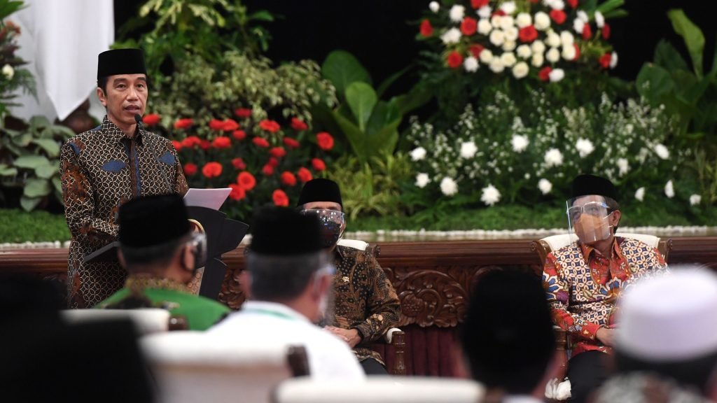 Presiden Republik Indonesia, Joko Widodo, membuka Musyawarah Kerja Nasional dan Musyawarah Nasional Alim Ulama Partai kebangkitan Bangsa di Istana Negara, Jakarta pada Kamis, 8 April 2021.