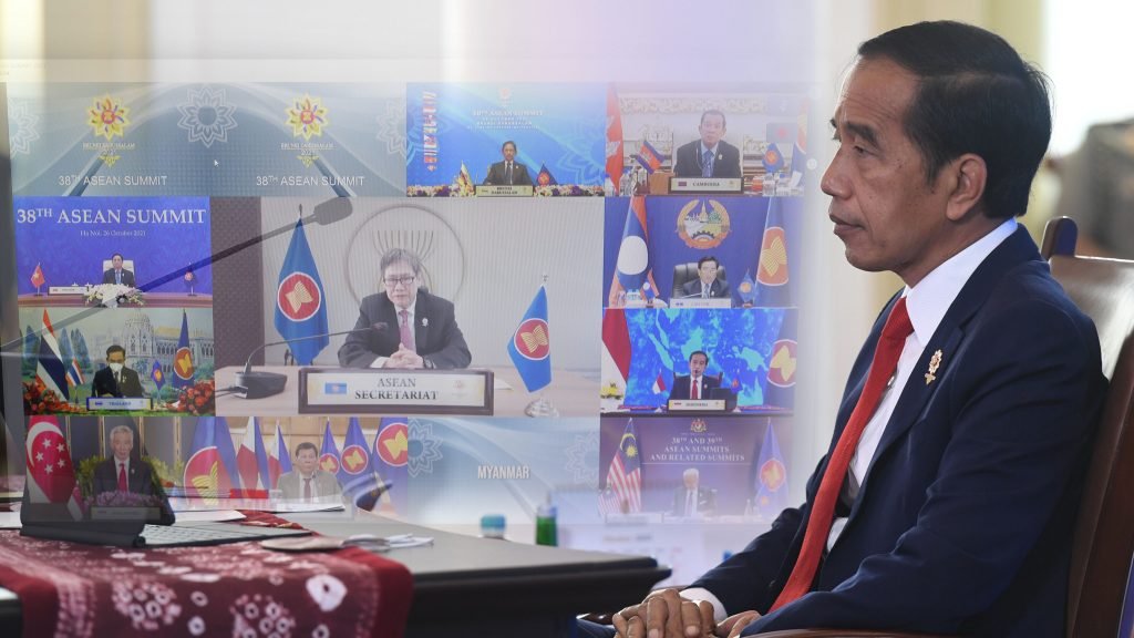 Presiden Joko Widodo dalam pidatonya pada Konferensi Tingkat Tinggi (KTT) ASEAN ke-38 yang digelar secara virtual pada Selasa, 26 Oktober 2021 dari Istana Kepresidenan Bogor, Jawa Barat, menegaskan, penurunan angka kasus Covid-19 di kawasan ASEAN harus bisa dimanfaatkan sebagai momentum untuk bangkit bersama.