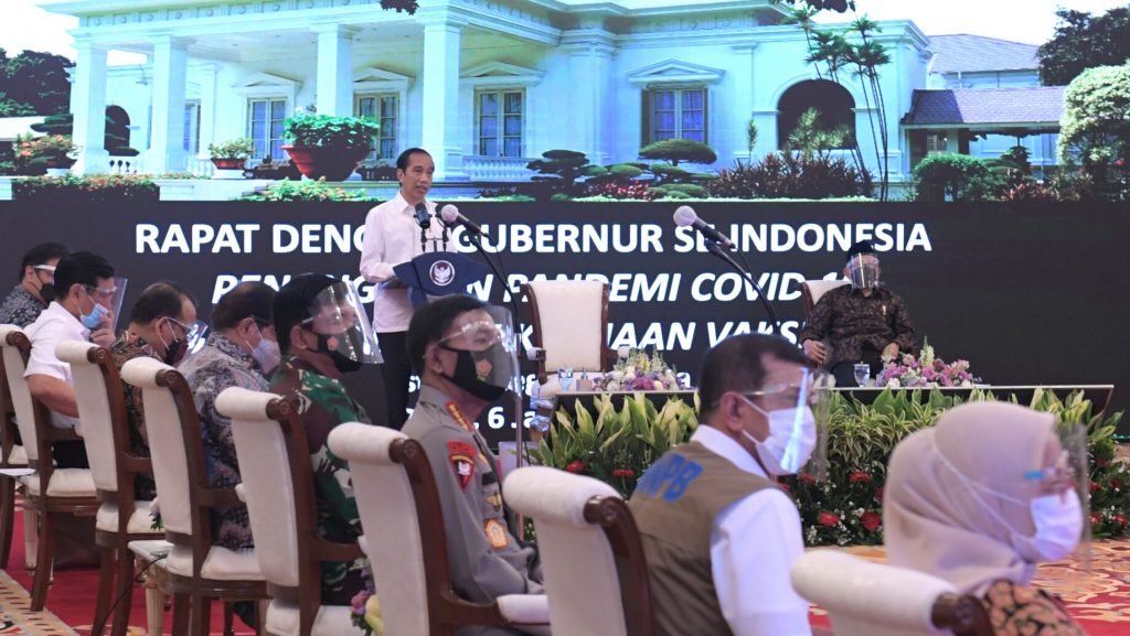 Presiden RI memberikan arahan dalam rapat terbatas mengenai penanganan pandemi Covid-19 dan rencana pelaksanaan vaksinasi di Istana Negara, Jakarta, pada Rabu, 6 Januari 2021, meminta pemerintah daerah untuk bersiap menjalankan program vaksinasi ini di wilayah masing-masing.