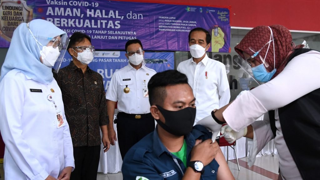 Presiden Republik Indonesia, Joko Widodo, melakukan inspeksi mendadak kegiatan vaksinasi Covid-19 massal untuk para pedagang di Blok A Pasar Tanah Abang di Jakarta pada Rabu, 17 Februari 2021.