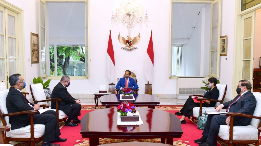 Presiden Joko Widodo menerima kunjungan kehormatan Menteri Luar Negeri Malaysia Dato’ Saifuddin Abdullah di Istana Merdeka, Jakarta, pada Senin, 18 Oktober 2021.