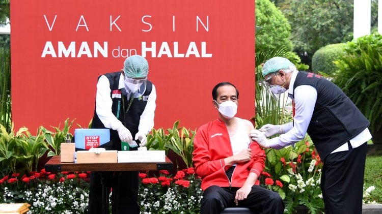 Presiden RI, Joko Widodo menerima penyuntikan dosis kedua vaksin Covid-19 di sisi barat halaman tengah kompleks Istana Kepresidenan, Jakarta pada Rabu, 27 Januari 2021.