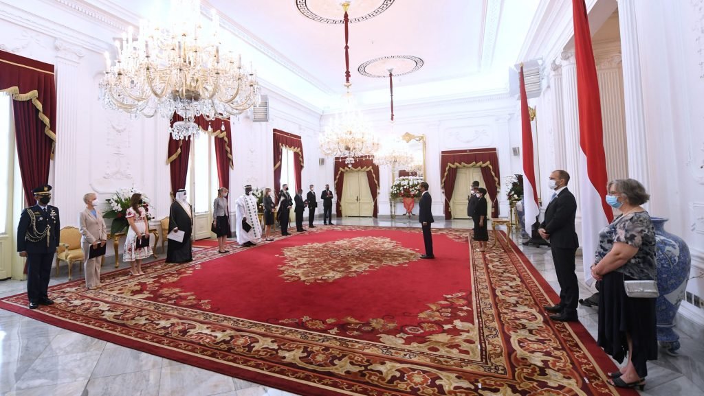 Presiden Joko Widodo menerima surat kepercayaan dari sembilan duta besar luar biasa dan berkuasa penuh (LBBP) negara-negara sahabat. Penyerahan surat kepercayaan tersebut digelar di Ruang Kredensial, Istana Merdeka, Jakarta, pada Senin, 25 Oktober 2021.