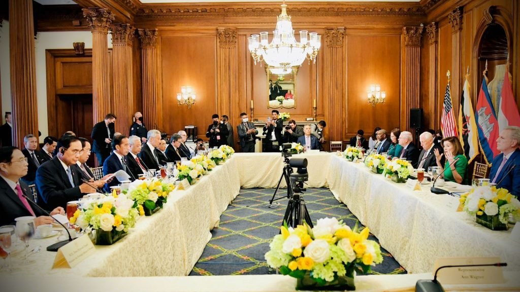 Presiden Joko Widodo mengajak Amerika Serikat (AS) untuk menjadi bagian dari upaya menciptakan perdamaian, stabilitas, dan kerja sama inklusif yang saling menguntungkan di Indo-Pasifik. Demikian pernyataan Presiden Jokowi saat menyampaikan sambutannya pada jamuan santap siang pemimpin negara-negara ASEAN oleh Ketua Dewan Perwakilan AS Nancy Pelosi dan Anggota Kongres AS di Capitol Hill, Washington DC, Kamis, 12 Mei 2022.