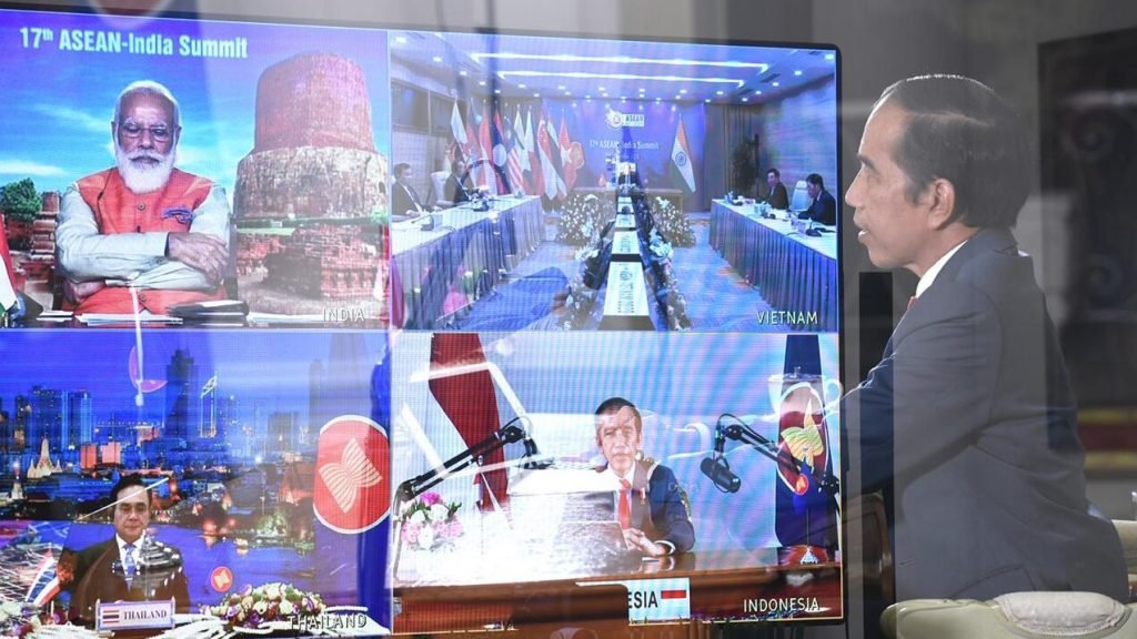 Presiden Joko Widodo menyampaikan pidato pada KTT ke-17 ASEAN-India secara virtual melalui konferensi video dari Istana Kepresidenan Bogor, Provinsi Jawa Barat, pada Kamis, 12 November 2020. Presiden Jokowi meyakini bahwa ASEAN dan India dapat memperkuat kerja sama dalam berbagai bidang untuk menghadapi berbagai tantangan yang akan menghadang di masa mendatang.