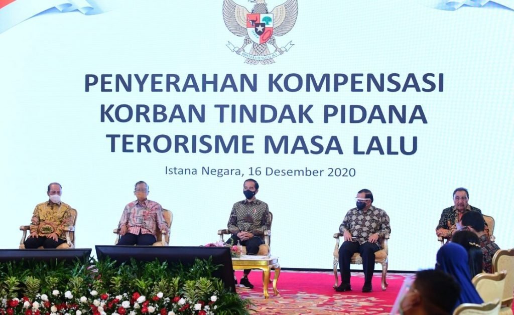 Presiden Jokowi menyerahkan kompensasi bagi korban tindak pidana terorisme masa lalu di Istana Negara, Jakarta, Rabu, 16 Desember 2020.