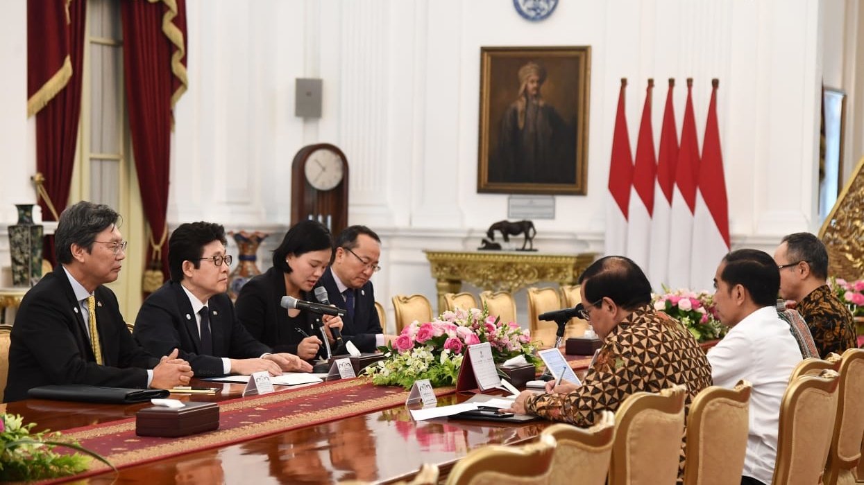 Presiden Jokowi menerima kunjungan Menteri Lingkungan Hidup (LH) Korea Selatan Cho Myung-Rae di Istana Merdeka, Jakarta, Selasa, 25 Februari 2020.