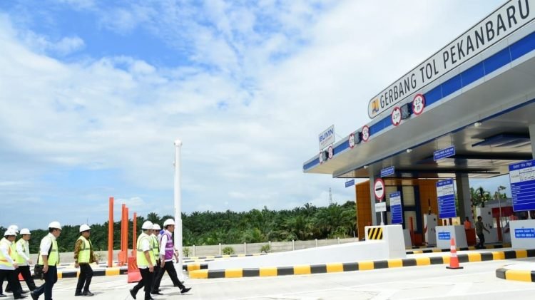 Presiden Jokowi meninjau perkembangan pembangunan jalan tol ruas Pekanbaru-Dumai Seksi 1 di Gerbang Tol Pekanbaru, Kecamatan Rumbai, Provinsi Riau, Jumat, 21 Februari 2020.