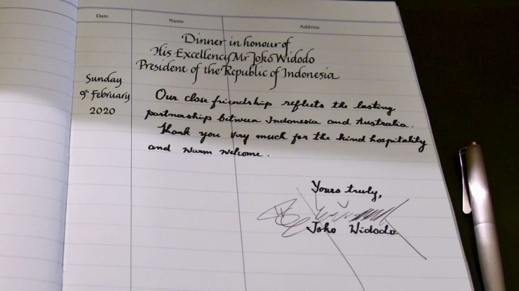 Dalam buku tamu, Presiden Jokowi menulis, “Persahabatan dekat kita mencerminkan kemitraan jangka panjang antara Indonesia dan Australia. Terima kasih banyak atas keramahan dan sambutan hangatnya.”