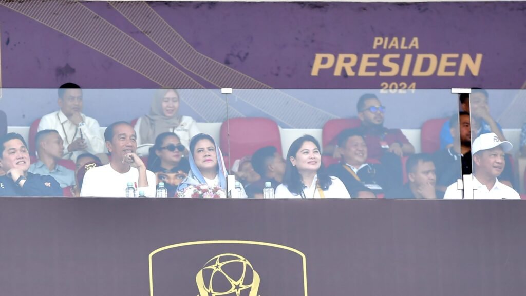 Presiden Joko Widodo didampingi Ibu Negara Iriana Joko Widodo menyaksikan laga perdana pembukaan turnamen sepak bola Piala Presiden 2024 di Stadion Si Jalak Harupat, Kabupaten Bandung, Provinsi Jawa Barat, pada Jumat, 19 Juli 2024. Laga mempertemukan Persib Bandung melawan PSM Makassar.