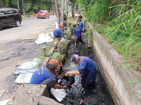 Satuan Pelaksana Sumber Daya Air (Satpel SDA) Kecamatan Kelapa Gading, Jakarta Utara, melakukan pengurasan saluran air Jl Pegangsaan Dua (sisi timur).