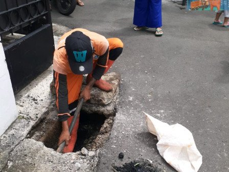 Saluran di Jalan Tebet Timur Dalam III H, RT 03/03, Kelurahan Tebet Timur, Senin (2/11), dikuras petugas Penanganan Prasarana dan Sarana Umum (PPSU).