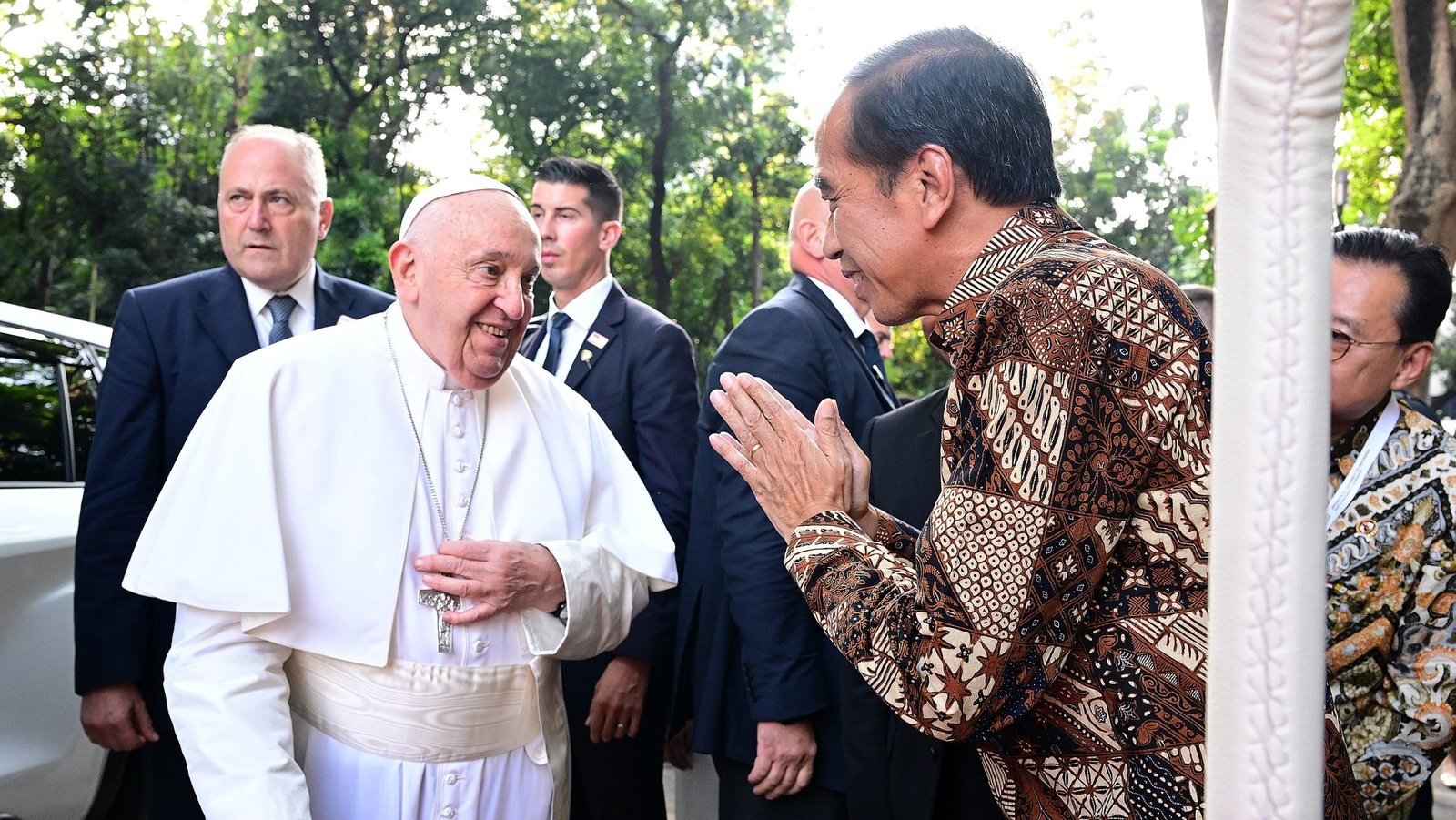 Turut mendampingi Presiden Jokowi saat menyambut Paus Fransiskus di GBK yakni Menteri Koordinator Bidang Kemaritiman dan Investasi Luhut Binsar Pandjaitan, Menteri Sekretaris Negara Pratikno, Panglima TNI Jenderal Agus Subiyanto, dan Kapolri Jenderal Listyo Sigit Prabowo.