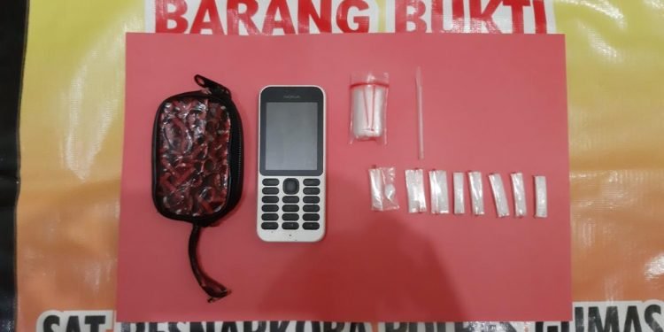 “Saat dilakukan penggeledahan pada badan, pakaian dan sekitarnya dan ditemukan barang bukti berupa 1 (satu) buah plastik klip bening ukuran sedang yang didalamnya berisi 8 (delapan) Paket Plastik Klip yang berisi serbuk kristal diduga narkotika jenis sabu, 1 (satu) buah HP Merk Nokia warna putih beserta Sim Card, 1 (satu) buah dompet kecil bercorak merah hitam, 1 (satu) lembar celana panjang jeans warna biru, 1(satu) buah sendok sabu terbuat dari sedotan, 1 (satu) unit motor merk Honda Beat warna putih dengan Nopol KH 5269 HG,” terang Iptu Untung.