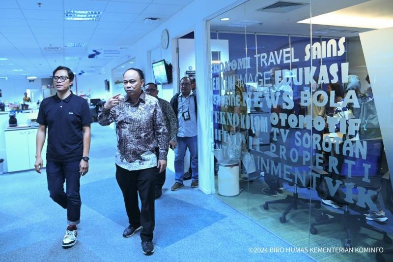 Dalam kunjungan ke Redaksi kompas.com, Menkominfo Budi Arie didampingi Direktur Jenderal Informasi dan Komunikasi Publik Prabunindya Revta Revolusi dan Staf Khusus Menteri Sugiharto.