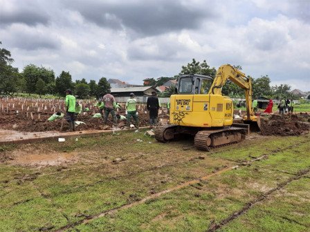 Satu unit alat berat jenis backhoe bantuan dari Dinas Bina Marga dikerahkan untuk mempercepat proses penggalian makam korban COVID-19 di TPU Bambu Wulung, Bambu Apus, Cipayung, Jakarta Timur, Kamis (4/2).