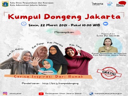 Sebanyak 1.000 peserta yang terdiri dari anak-anak, guru, orang tua dan masyarakat umum, Senin (22/3), ikut meramaikan giat Kumpul Dongeng Jakarta (KDJ) yang diselenggarakan Suku Dinas Perpustakaan dan Kearsipan (Pusip) Jakarta Selatan secara virtual.