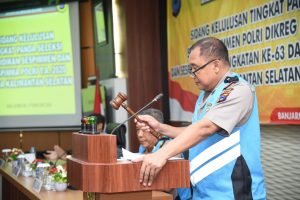 Sebanyak 23 (Dua puluh tiga) peserta pendidikan pengembangan umum (Dikbangum) Polri TA. 2020, pada hari Rabu (5/2/2020) pukul 08.00 wita mengikuti sidang kelulusan tingkat Panitia Daerah (Panda) yang dipimpin langsung oleh Kepala Kepolisian Daerah Kalimantan Selatan Inspektur Jenderal Polisi Drs. Yazid Fanani, M.Si. dan dihadiri oleh Irwasda, Pejabat Utama Polda Kalsel, Panitia Seleksi dan para peserta seleksi bertempat di Rupatama Polda Kalsel.