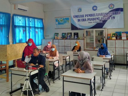 SMPN 255 Duren Sawit, Jakarta Timur, Selasa (30/3), menggelar simulasi kegiatan belajar mengajar (KBM) secara hybrid. Yakni metode pembelajaran yang memadukan antara pembelajaran jarak jauh murni dengan metode tatap muka secara fisik.
