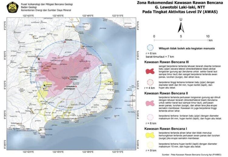 “Hasil analisis visual dan instrumental menunjukkan bahwa aktivitas Gunungapi Lewotobi Laki-laki masih tergolong tinggi. Oleh karena itu, tingkat aktivitas gunungapi ini dinaikkan dari Level III (Siaga) ke Level IV (Awas) pada pukul 20.00 WITA. Masyarakat dan wisatawan diimbau untuk tidak melakukan aktivitas dalam radius 6 km dan sektoral barat-timur laut sejauh 7 km dari pusat erupsi,”ujar Kepala Badan Geologi Muhammad Wafid di Bandung hari ini, Minggu (18/5).
