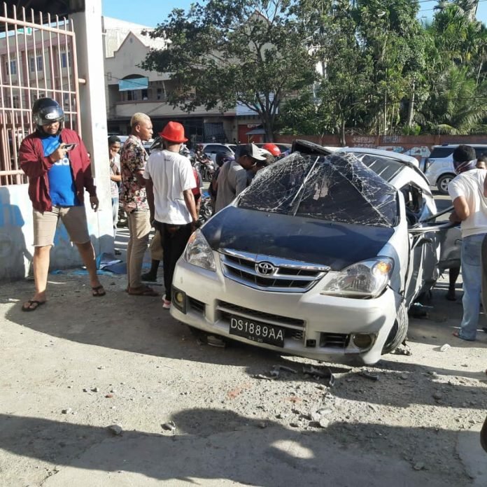 Dimana sebuah mobil minibus bus Toyota Avanza dengan plat polisi DS 1889 AA yang membawa enam orang penumpang terbalik usai menabrak taluk di depan sebuah toko di seputaran Waena.