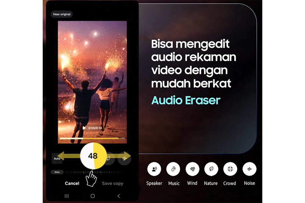 Ilustrasi penggunaan Audio Eraser yang bisa menghilangkan/mengurangi enam jenis suara berbeda (speaker, music, wind, nature, crowd, dan noise) sesuai kebutuhan