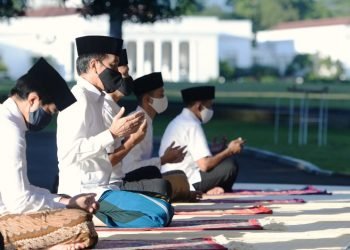 Presiden Joko Widodo bersama dengan Ibu Negara Iriana Joko Widodo melaksanakan salat Idulfitri 1441 H di halaman depan Wisma Bayurini, ...