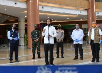 Presiden Jokowi meninjau kesiapan penerapan prosedur standar tatanan baru di salah satu pusat niaga di Kota Bekasi, Provinsi Jawa Barat, ...
