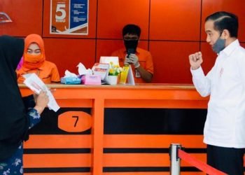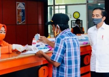 Presiden Joko Widodo meninjau penyerahan bantuan tunai kepada sejumlah keluarga penerima manfaat yang digelar di Kantor Pos Jalan Ir. H. ...