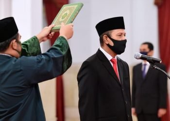 Presiden Jokowi menyaksikan pengucapan sumpah Dian Ediana Rae sebagai Kepala Pusat Pelaporan dan Analisis Transaksi Keuangan (PPATK) dengan menerapkan protokol ...