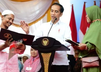 Presiden Jokowi menyerahkan 2.576 sertifikat hak atas tanah di Lapangan Futsal Galacticos Cot Gapo, Kabupaten Bireuen, Provinsi Aceh, Sabtu, 22 ...