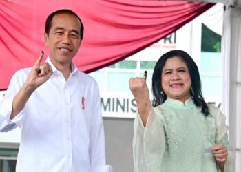 Presiden Joko Widodo didampingi Ibu Iriana Joko Widodo menggunakan hak pilihnya di Tempat Pemungutan Suara (TPS) 10, Kecamatan Gambir, Jakarta ...