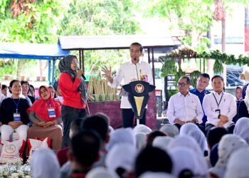 Presiden Joko Widodo bersilaturahmi dengan nasabah program Membina Ekonomi Keluarga Sejahtera (Mekaar) binaan Permodalan Nasional Madani (PNM) di Lapangan Lima ...