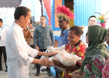 Presiden Joko Widodo membagikan bantuan pangan Cadangan Beras Pemerintah (CBP) kepada sejumlah Keluarga Penerima Manfaat (KPM) di Komplek Pergudangan Bulog ...