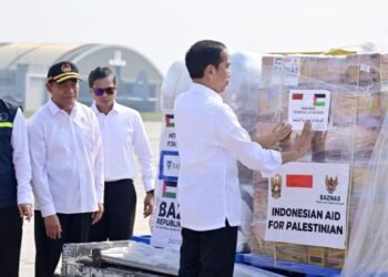 Presiden Joko Widodo melepas bantuan kemanusiaan tahap kedua Indonesia untuk Palestina di Pangkalan TNI AU Halim Perdanakusuma, Jakarta, pada Senin, ...