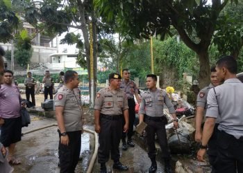 Personel Polres Cimahi Polda Jabar Bantu Korve dan Bersihkan Lokasi yang Terdampak Banjir Di Perumahan Cimareme Indah