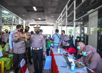 Kepala Korps Lalu Lintas (Kakorlantas) Polri, Irjen Istiono meninjau pelaksanaan vaksinasi para pengemudi ojek online (ojol) dan angkutan umum di ...