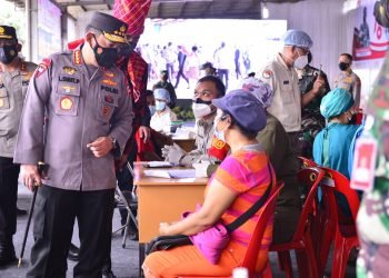 Sumatera Utara – Panglima TNI Marsekal Hadi Tjahjanto bersama Kapolri Jenderal Listyo Sigit Prabowo meninjau kegiatan vaksinasi di Pasar Induk ...
