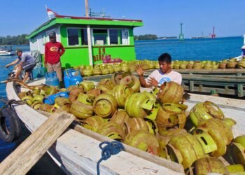 Awak kapal sedang menyalurkan gas elpiji 3 Kg saat tiba di pelabuhan pulau Karimunjawa, Jepara, Jawa tengah. Suplai gas Elpiji ...