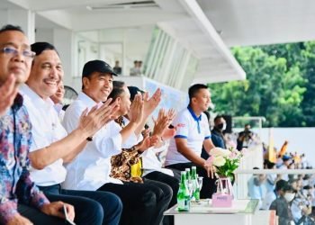 Presiden Joko Widodo menyaksikan pertandingan cabang olahraga lari estafet regu putra dan putri dalam kompetisi Student Athletics Championship (SAC) Indonesia ...