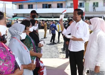 Presiden Joko Widodo didampingi Ibu Iriana Joko Widodo menyerahkan Bantuan Modal Kerja (BMK) dan Bantuan Langsung Tunai (BLT) minyak goreng ...