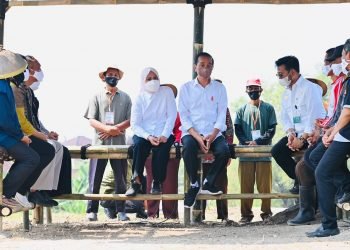 Presiden Joko Widodo dan Ibu Iriana Joko Widodo berdialog dengan sejumlah petani selepas menanam kelapa genjah bersama di Desa Giriroto, ...