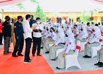 Presiden Joko Widodo meninjau kegiatan vaksinasi bagi pelajar yang digelar di SMKN 1 Beringin, Kabupaten Deli Serdang, pada Kamis, 16 ...