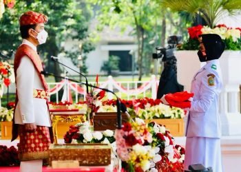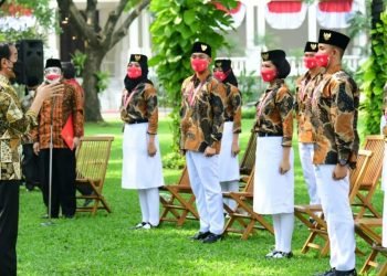Presiden Joko Widodo memberikan pengarahan kepada para Purnapaskibraka tahun 2021 yang juga ditetapkan menjadi Duta Pancasila di halaman tengah Istana ...